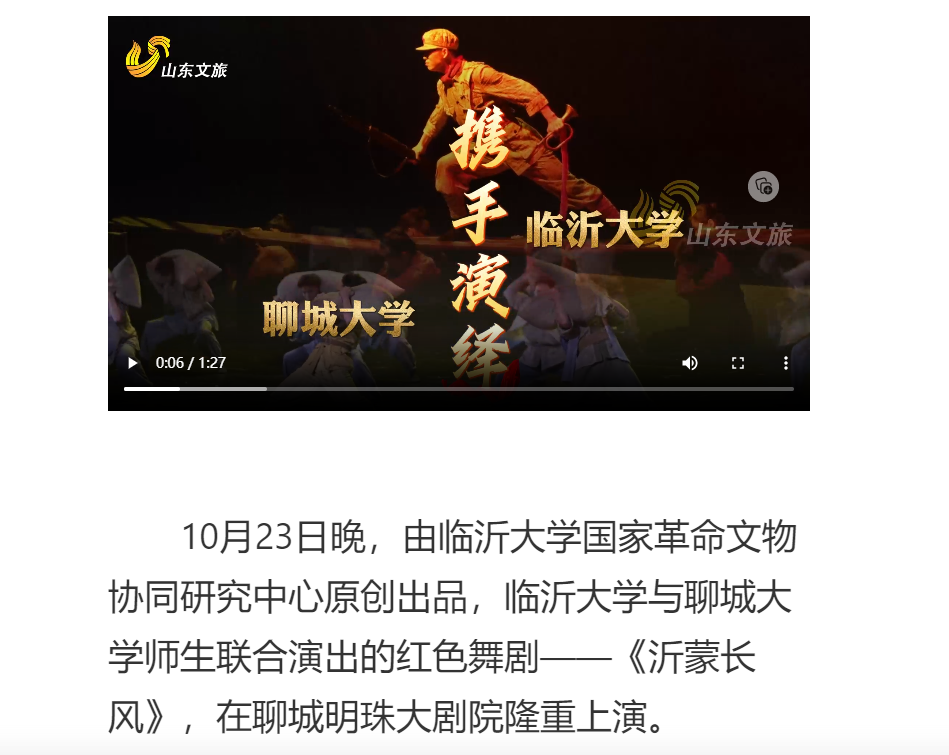10 月 23 日晚,由成人网 、临沂大学音乐学院两院舞蹈系160 余位师生联合排演的大型舞剧《沂蒙长风》圆满公演,受到师生、社会的广泛好评。山东卫视文旅频道、齐鲁晚报、山东商报、聊城日报、聊城电视台、新华网、大众网、齐鲁壹点网、网易网、搜狐网等多家媒体对演出盛况进行报道,让《沂蒙长风》承载的红色精神通过更多渠道传播,影响更多人。