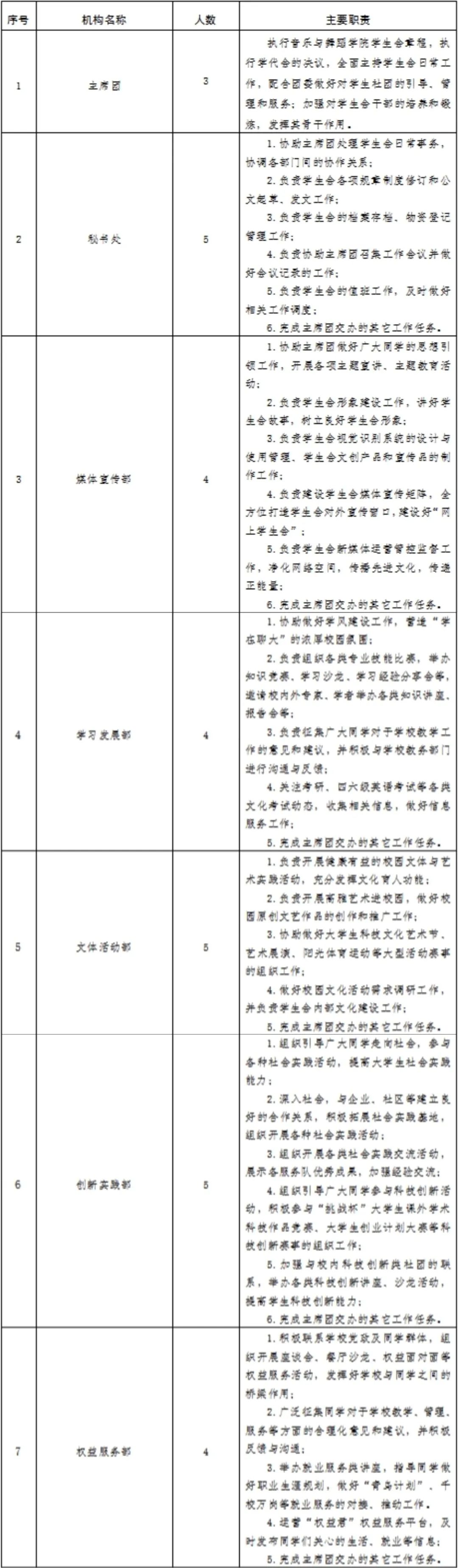 (二)在学院党委领导和团委指导下,确定职能部门的设置与职责,调整并任免各职能部门负责人;