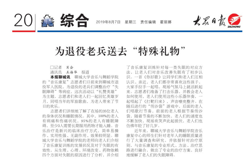 2019年8月7日《大众日报》以《为退役老兵送去特殊“礼物”》为题报道了成人网 暑期社会实践活动。
