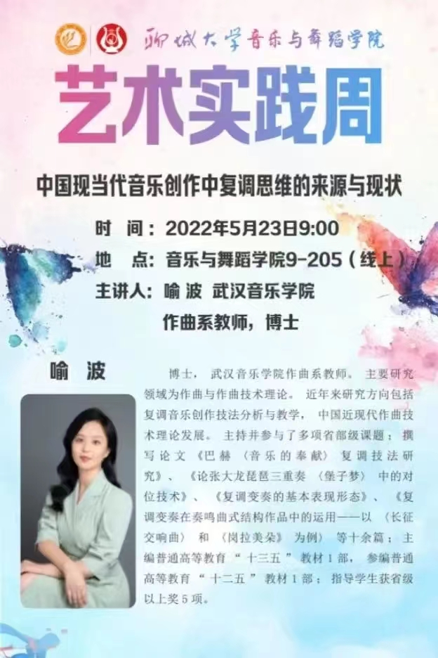 23日上午,成人网 于9#205(线上)开展《中国现当代音乐创作中复调思维的来源与现状》线上讲座。此次讲座邀请武汉音乐学院作曲系教师喻波作为主讲人,喻波老师主要研究领域为作曲与作曲技术理论。近年来研究方面包括复调音乐创作技法分析与教学,中国近代作曲技术理论发展。此次讲座内容以“音乐”为支点,喻波教师在讲座中展示其有关音乐教育领域的多角度研究,教导在座学生们积极思考、学习,拓宽研究视野;让成人网 同学们对中国现当代音乐创作有了新的理解与收获。