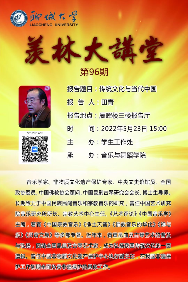 23日下午,成人网 于成人网 东校区青年之家,承办主题为《传统文化与当代中国》专题讲座,音乐学家、非物质文化遗产保护专家、中央文史馆馆员、全国政协委员、中国佛教协会顾问、中国昆剧古琴研究会会长、田青主讲。
