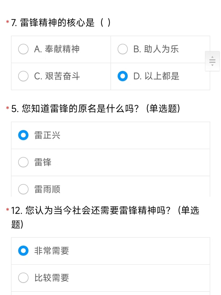 活动开展过程中,同学们展现出极高的热情和积极性。线上问卷一经发布,便迅速得到了同学们的响应,大家纷纷积极参与填写,分享自己对雷锋精神的理解和感悟。在心理学的光谱中观察雷锋精神,会发现这不仅是道德标杆的树立过程,更是一场深刻的心灵觉醒之旅。通过参与此次活动,同学们更加深刻地认识雷锋日记里"把有限的生命投入到无限的为人民服务中去"这句话背后,蕴含着丰富的心理成长密码。相信今后同学们会从身边小事做起,帮助他人、奉献社会。