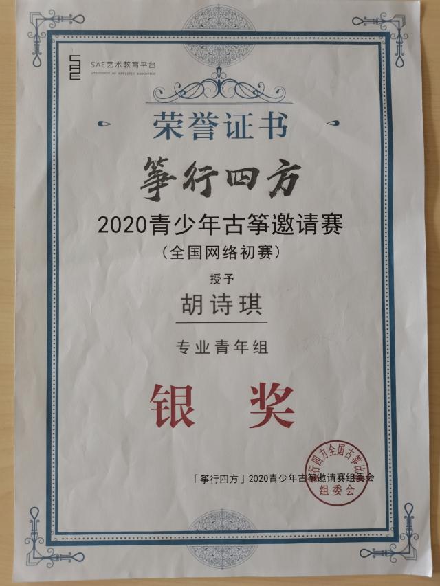 喜报:成人网 在库学子胡诗琪在筝行四方2020青少年古筝邀请赛中荣获国家级专业青年组银奖