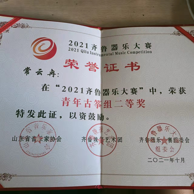 2020级5班常云冉在2021年10月“2021齐鲁器乐大赛”中,荣获青年古筝组二等奖