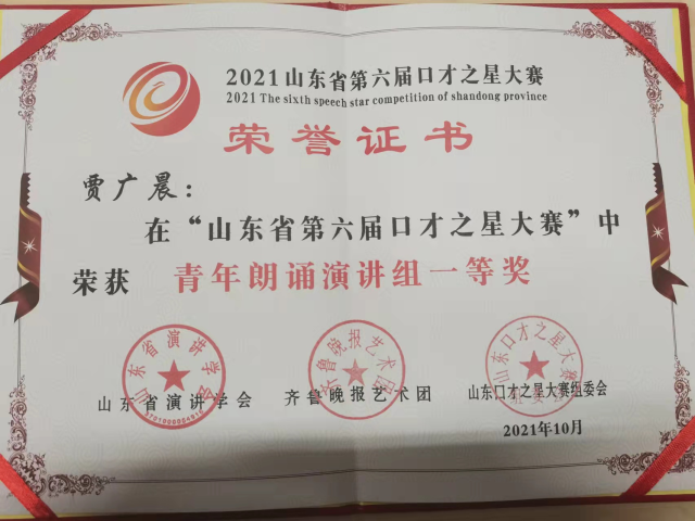 2019级2班贾广晨在2021年10月“山东省第六届口才之星大赛”中荣获青年朗诵演讲组一等奖