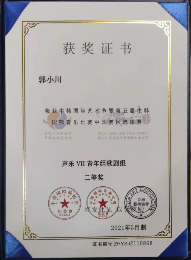 2018级5班郭小川第五届中韩国际音乐比赛中国赛区选拔赛获声乐VII青年组歌剧组二等奖