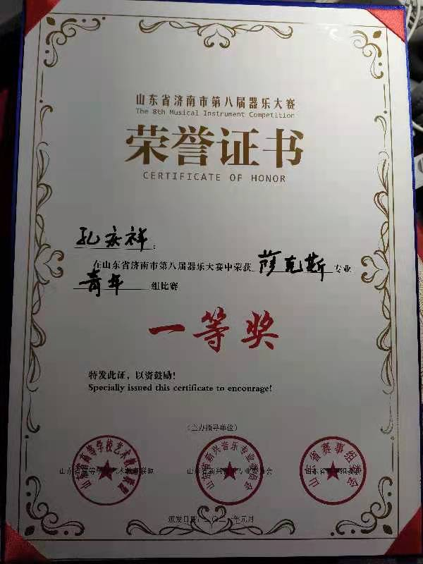2019级4班孔庆祥在2021年山东省济南市第八届器乐大赛中荣获萨克斯青年组比赛