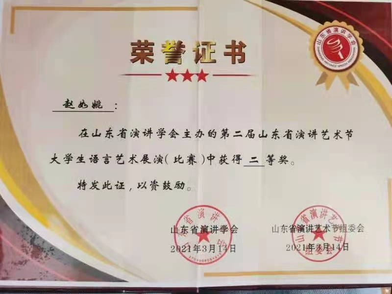 2018级5班赵如姚在2021年3月在“在山东省演讲学会主办的第二届山东省演讲艺术节 大学生语言艺术展演(比赛)中获得二等奖