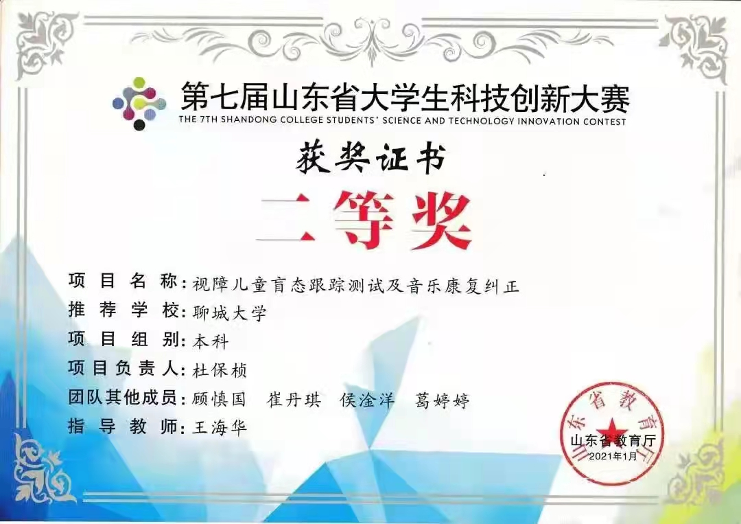 2018级7班顾慎国在2021年1月山东省大学生第七届山东省大学生科技创新大赛二等奖
