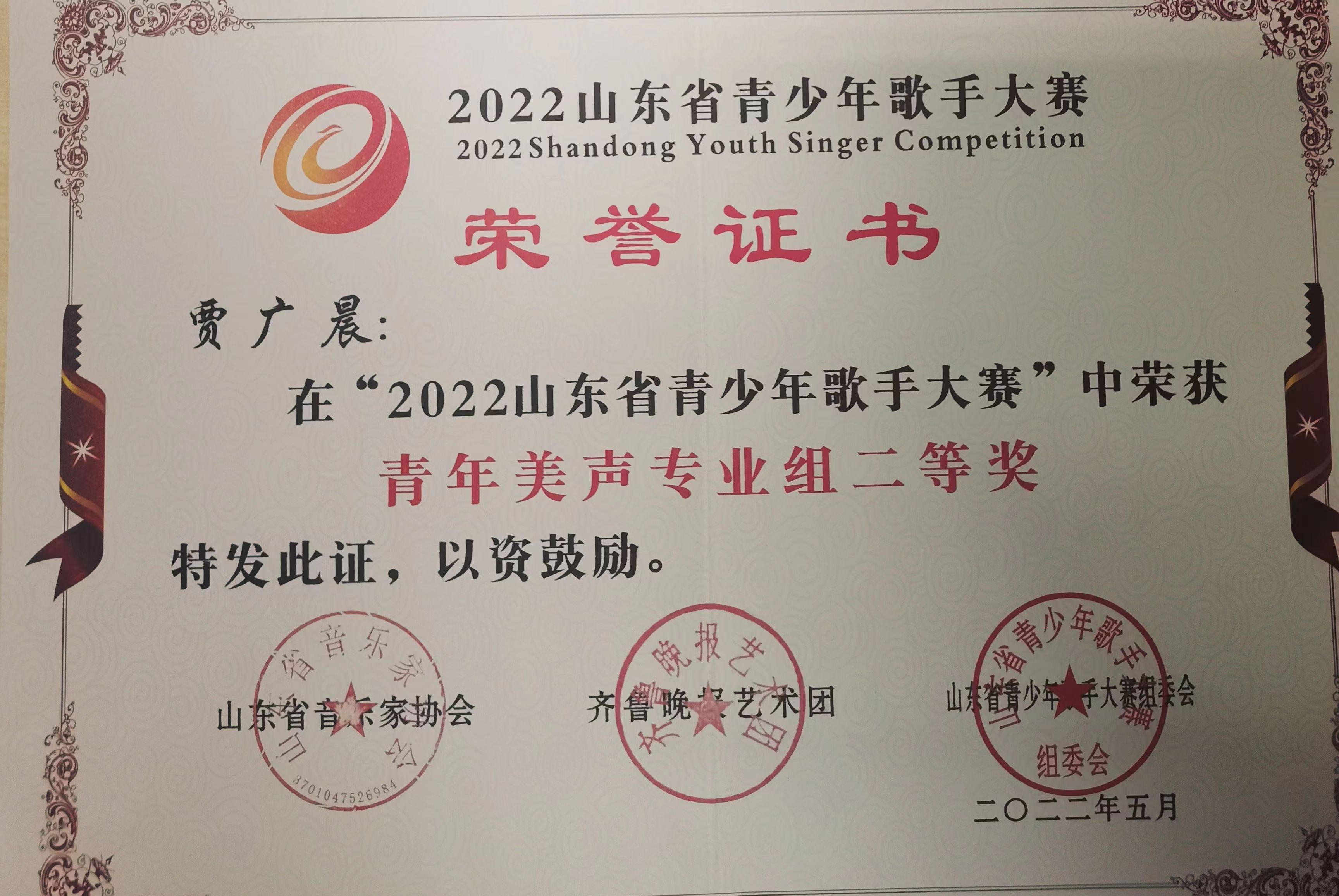 成人网 贾广晨在”2022山东省青少年歌手大赛“中荣获青年美声专业组二等奖