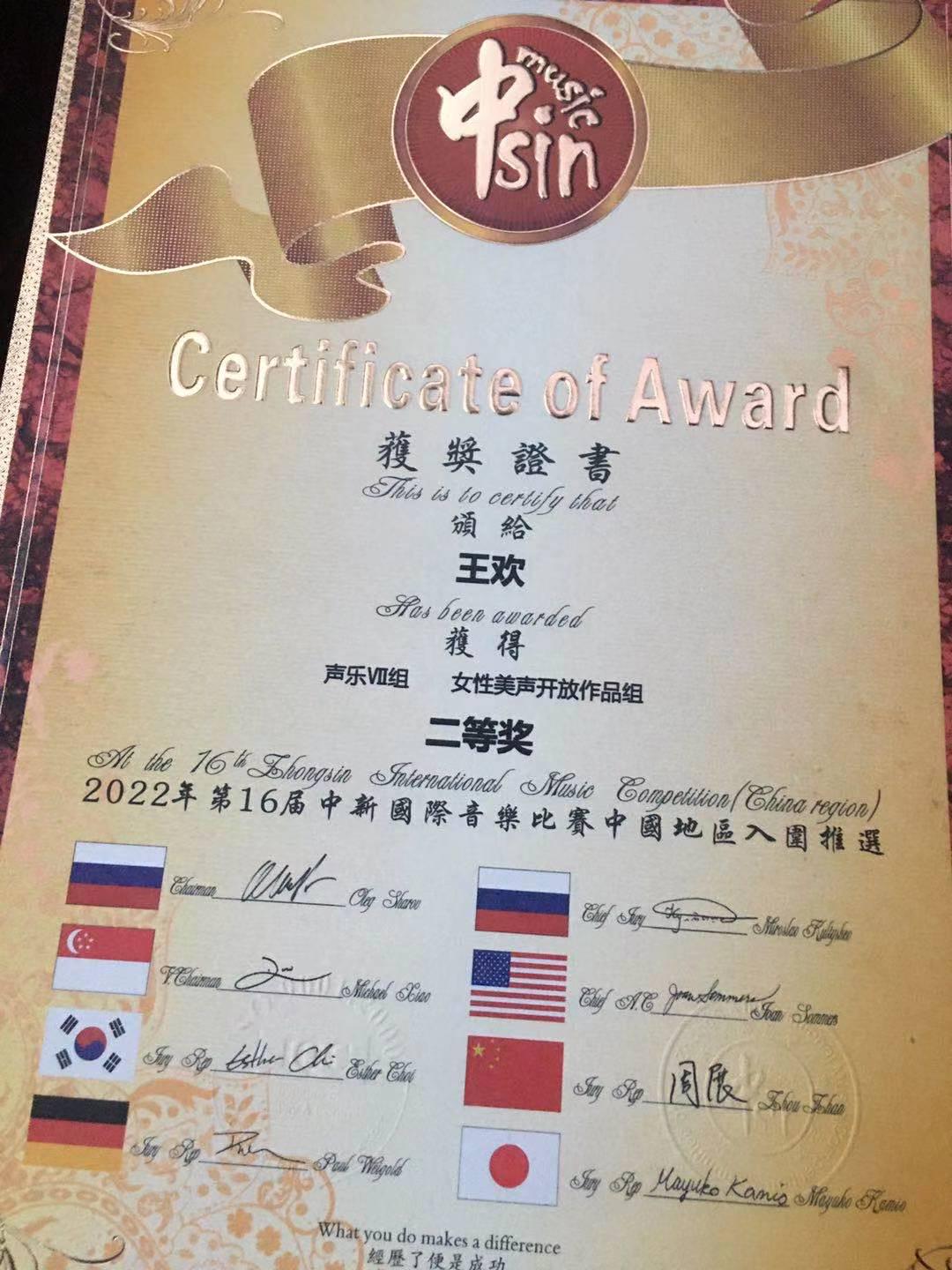 成人网 王欢在”2022第十六届中新国际比赛“中荣获二等奖