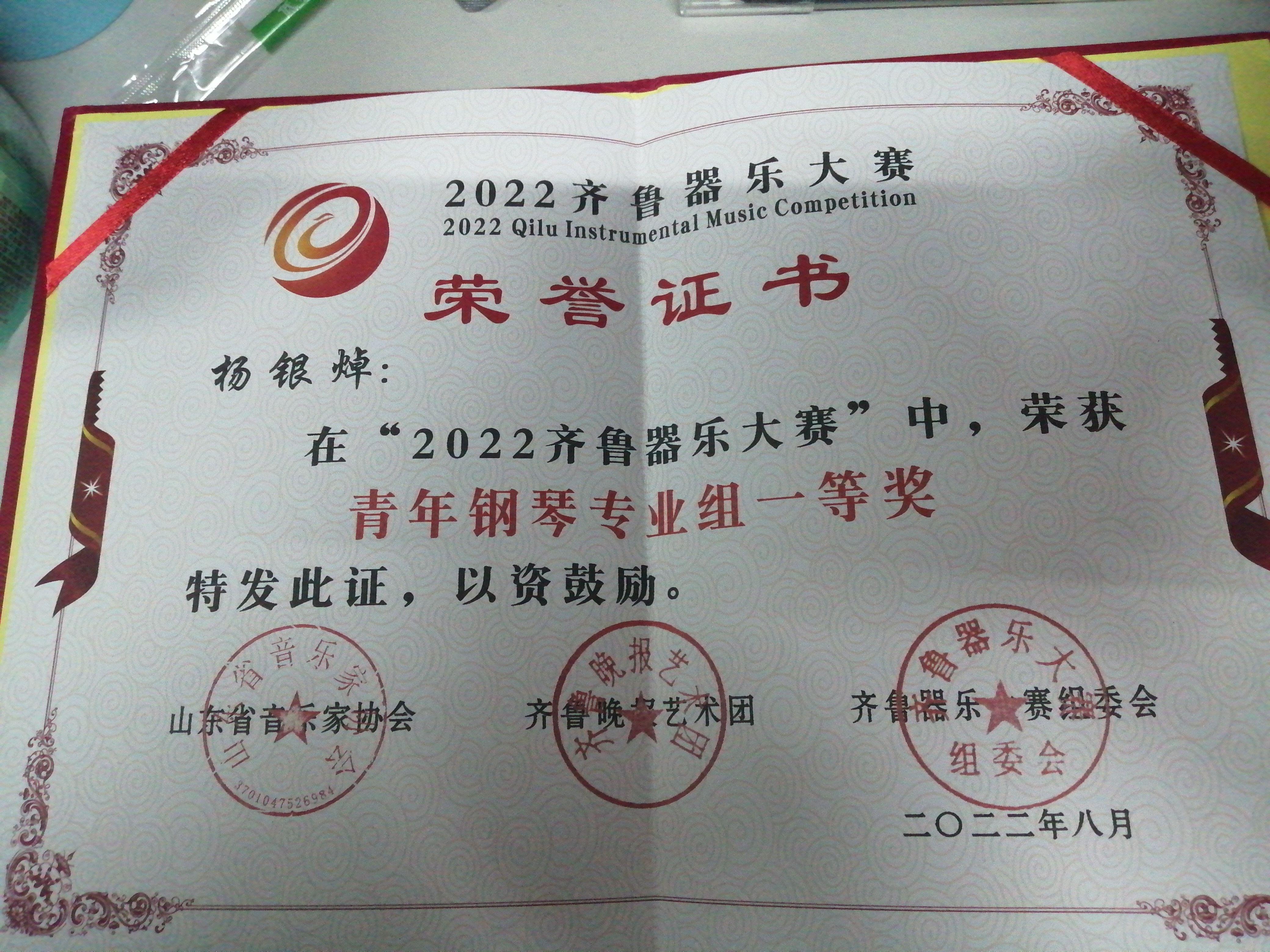 成人网 杨银焯在”2022中齐鲁器乐大赛”中荣获青年钢琴专业组一等奖