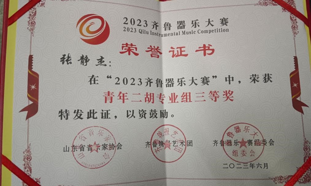 张静杰荣获“2023齐鲁器乐大赛”三等奖