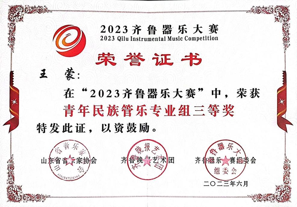 王蒙荣获“2023齐鲁器乐大赛”三等奖