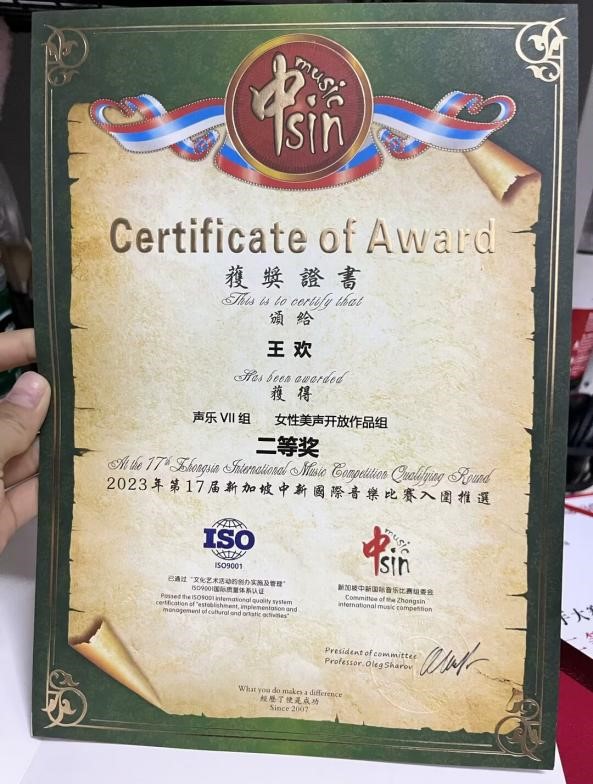 成人网 王欢荣获“第17届新加坡中新国际音乐比赛”二等奖