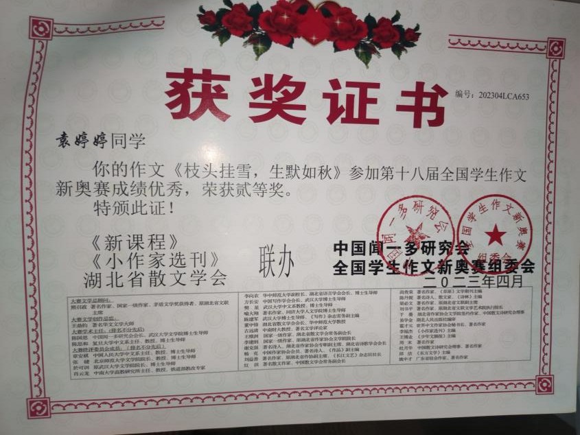 袁婷婷荣获“第十八届全国学生作文新奥赛”二等奖