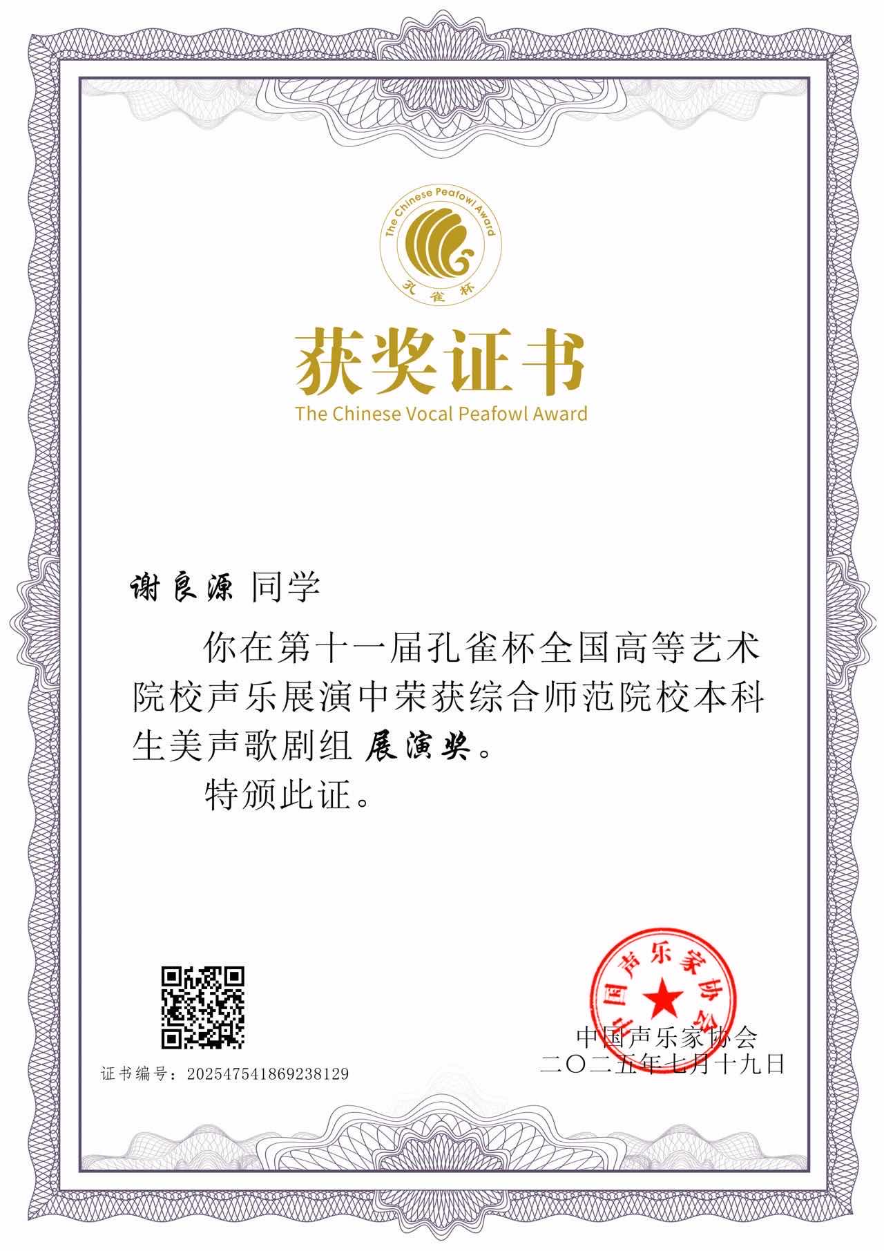 成人网 家庭经济困难学生谢良源在第十一届孔雀杯全国高等艺术院校声乐展演中荣获综合师范院校本科生美声歌剧组展演奖。展现了个人坚韧不拔的精神风貌,也体现了学院在培养学生艺术素养方面所取得的成果。