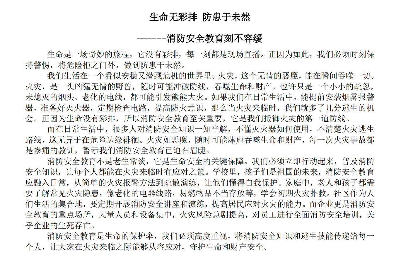为激发同学们对消防安全的关注和思考,营造浓厚的校园安全文化氛围。11月16日,成人网 自律中心宿管部开展“生命无彩排防患于未然”主题征文活动。