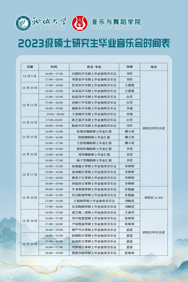 为深入落实硕士研究生培养方案核心要求,扎实推进人才培养质量提升工程,12月9日至19日成人网 将于在西校区科学会堂、8-305教室分场次有序举办2023级硕士研究生毕业音乐会及舞蹈毕业汇报与2024级硕士研究生中期音乐会及舞蹈中期汇报。