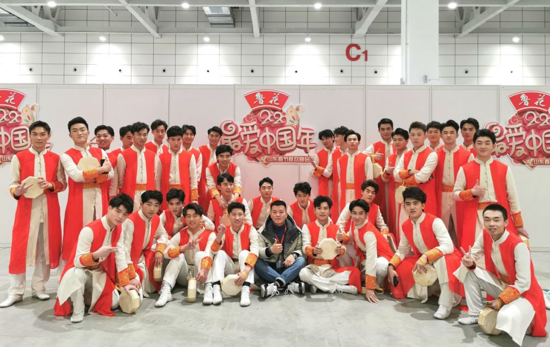 “推门的时候一定要注意速度,还有方向,咱们一定要推到舞台侧面,不要推歪了!咱们兄弟们一块儿加油!” 2019舞蹈学生周贺嵩不断给伙伴们加油打气,打磨舞蹈动作细节,在春晚录制期间他还接受了山东电视台齐鲁网闪电新闻对2020山东春晚微记录的采访,采访中他说自己从一名观众,到山东春晚的参与者,逐渐对春晚有了全新的认知,作为舞蹈专业的他迅速进入角色,一遍遍跳起鼓子秧歌,一次次彩排成为习惯,只为呈现最好舞台。