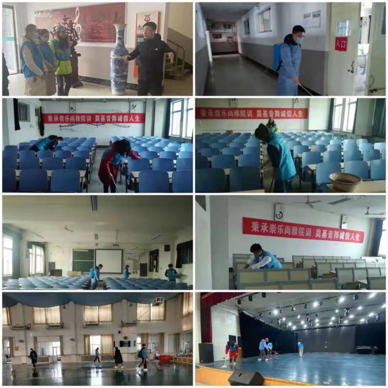为创设优美、整洁、卫生、安全的校园环境,确保全体师生的健康安全,确保学校能够顺利开学,2月26日下午,成人网 全体辅导员带领17名志愿者对学院办公室、教室、舞蹈房、音乐厅、走廊进行全面的清扫、消杀。