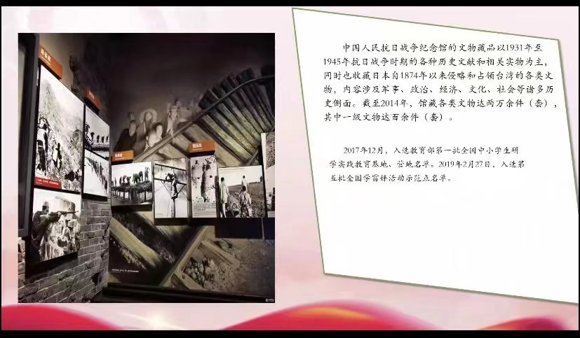 在21级刘彤的带领下,此次线上“红色云展厅”易班工作站的成员们参观了中国人民抗日战争纪念馆。中国人民抗日战争纪念馆是全国唯一一座全面反映中国人民抗日战争历史的大型综合性专题纪念馆。“红色云展厅”中展示的一张张珍贵的照片,一处处场景复原,一件件珍贵的历史文物,都诉说着中国在抗日战争时期的苦难。跟随着展厅的语音介绍,成员们充分地了解了中国人民抗日战争的艰苦历程,比如百团大战中我党的正确指挥,边区革命斗争的转危为安,众多抗日事迹在成员们的心中激荡。这些光辉事迹激励着我们秉承红色精神,将青春献给伟大祖国。