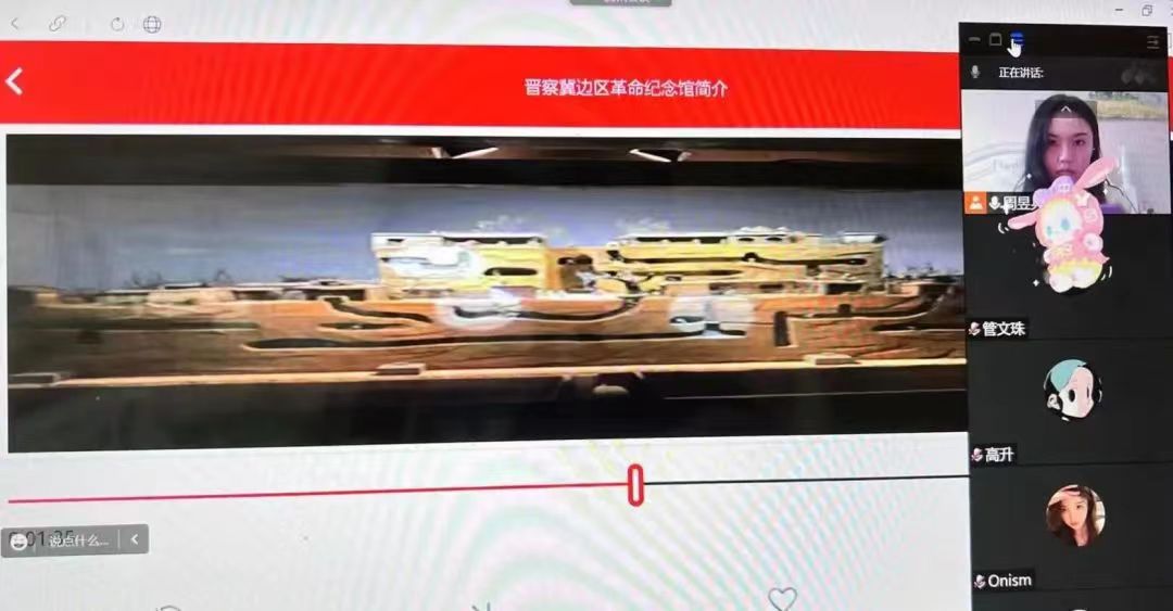 成人网 20级周昱兵通过“红色云展厅”为秘书处的成员们讲解了河北晋察冀边区革命纪念馆的历史由来以及它的光辉历程,带领大家走进河北保定市阜平县,用八路军英雄的故事让大家走进那个硝烟弥漫的时代:“1937年11月7日,八路军晋察冀军区在山西宣告成立,11天后,晋察冀军区机关迁往阜平,并在这里进行了艰苦卓绝的对日作战,军区战士前仆后继,浴血奋战,用思想和智慧构筑了抗战的坚强堡垒。”如今,晋察冀边区革命纪念馆也在通过景观复原、雕像的方式,结合声、光、电、幻影成像等技术,讲述着晋察冀抗日根据地的抗战历史。