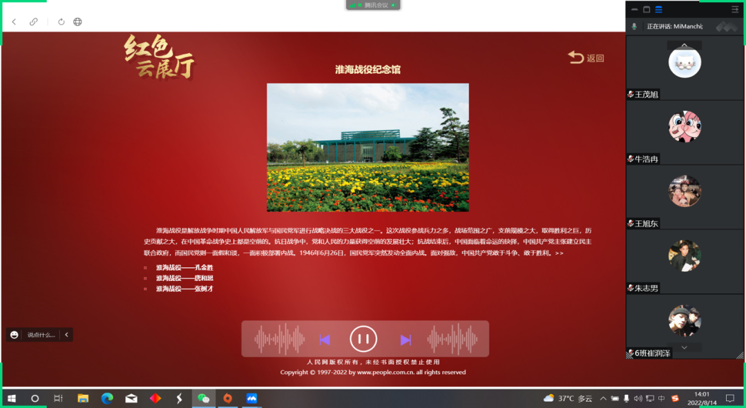 为传承红色基因,回顾党的百年奋斗历程,8月14日成人网 自律中心男生宿管部通过“红色云展厅”平台线上组织参观了“淮海战役纪念馆”。