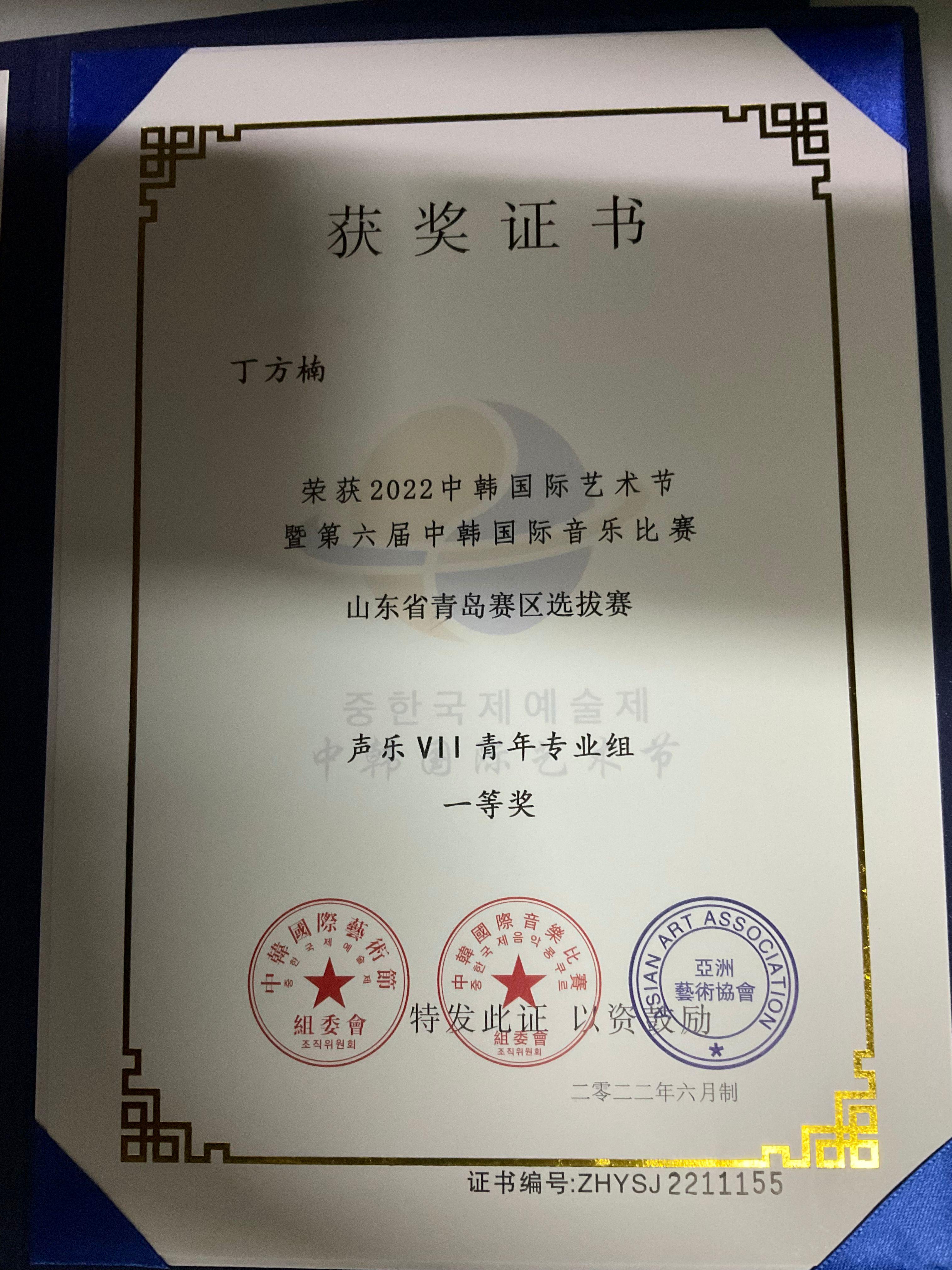 丁方楠在第六届中韩国际比赛中,声乐青年专业组荣获一等奖