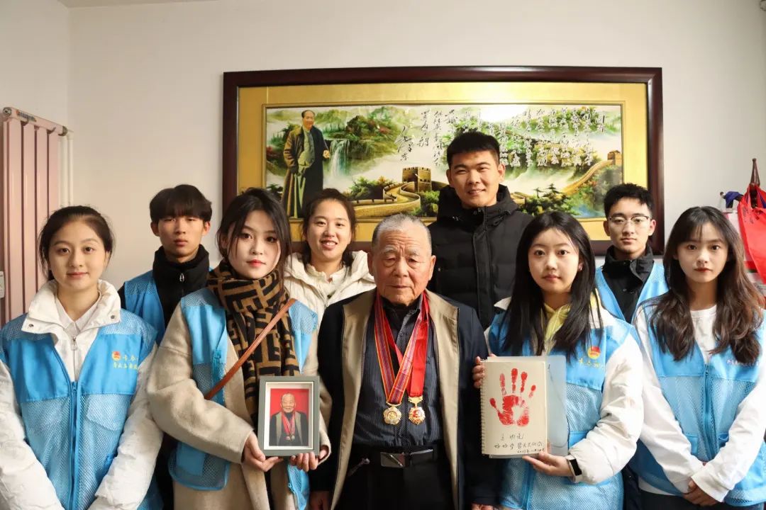 为了留住英雄的光辉形象,成人网 志愿服务队为王明亮爷爷准备了一份特殊的礼物,现场进行肖像照拍摄。王爷爷戴上他的奖章,在镜头里透出来坚毅的神情,虽然89岁高龄,但戴上奖章的他依然坐的笔直。随后,肖像照现场打印出来,队员们将照片放入准备好的相框里,送给了王爷爷。同时为了传承王爷爷的红色精神,志愿服务队还准备了印泥、记号笔、卡纸等,为王爷爷留下了他的手印,王爷爷为服务队的同学们亲笔写下了:好好学习,天天向上这一美好祝愿。