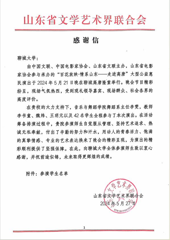 5月30日,山东省文学艺术界联合会向成人网 发来感谢信,感谢我校成人网 舞蹈系46位师生参加了中国文联、中国电影家协会、山东省文联主办的大型公益惠民演出。在感谢信中,山东文联充分赞扬了舞蹈系师生对艺术的追求、专业的艺术表达以及他们动人的青春活力、饱满的真挚情感,感谢他们的精彩呈现,为演出的精彩顺利提供坚强保障。