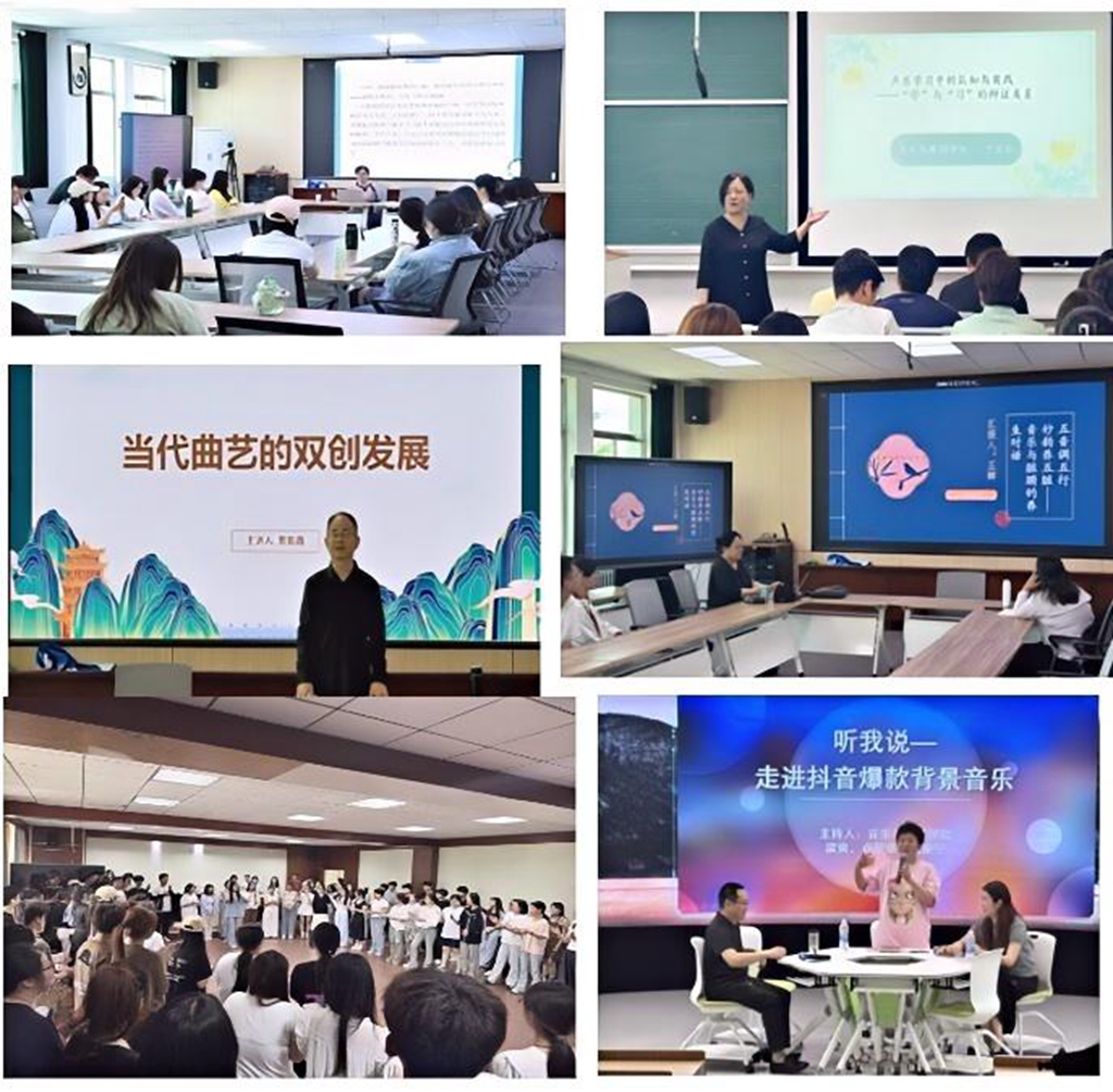 实践周期间,系列学术讲座与工作坊成为启迪师生智慧的重要引擎。中国戏曲学院赵建新教授,从中西戏剧发生之异同、戏曲的特征及发生学原理以及戏曲在当代的传承与发展等纬度讲述戏曲艺术的源流与风采;贾振鑫副教授结合短视频传播案例,探讨当代曲艺守正创新的双创发展之道;王辉教授《五音调五行,妙韵养五脏——音乐与脏腑的养生对话》的主题讲座深度启发听众探寻音乐的价值;俞淑华副教授以“山陕民间音乐中的黄河文化与精神”为主题,回溯历史脉络,解码民族音乐基因;于亚欣副教授以“场景化教学法”解析声乐学习中的“学”与“习”,带领学生通过肢体语言塑造歌曲意境;孙多英华老师的“奥尔夫教学法工作坊”以《两只老虎》为样本,通过声势律动与多声部创编,示范传统文化的现代化教学路径;梁爽、卢爱华、杨康宁三位老师的“抖音爆款背景音乐解析”则从音乐学与传播学双视角,解构流行音乐的破圈逻辑,为传统艺术传播提供新思路。每场讲座兼具学术深度与实践指导意义,推动师生在理论思辨与案例剖析中拓宽艺术视野,在学术交流中碰撞出智慧火花。