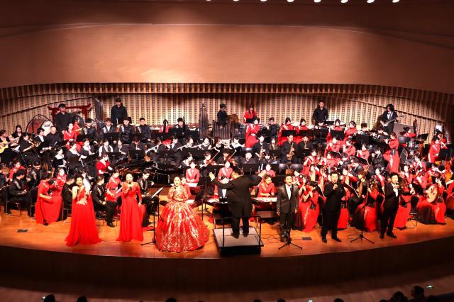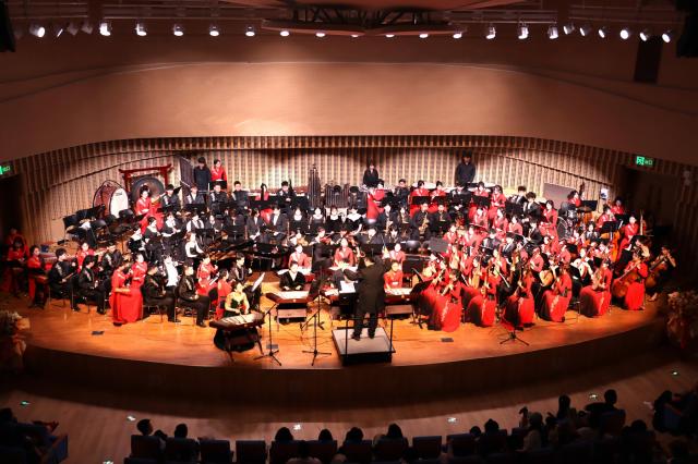 音乐会以声乐与交响《灯火里的中国》拉开序幕。在宏大的民族管弦乐伴奏下,成人网 6位声乐教师深情演绎,描绘出一幅奋进中国的温暖画卷,表达了对祖国的深情祝福。随后的古筝协奏曲《云裳诉》、竹笛协奏曲《雪意断桥》、琵琶协奏曲《云想花想》等经典民族器乐作品依次登场,古筝清丽的泛音和柔美的摇指再现盛唐气象;笛音婉转悠扬的旋律勾勒出西湖“断桥残雪”的唯美意境;琵琶丰富的音色变化与交响化的音乐叙事展现了盛唐的瑰丽想象与“诗仙”李白的浪漫情怀。之后,两件特色民族乐器柳琴与尺八分别与乐队协奏,行云流水般演出的《春到沂河》《望你早归》将音乐会推向高潮。音乐家王惠然对柳琴的改良,演奏家刘哲对尺八的双创,令人印象深刻。