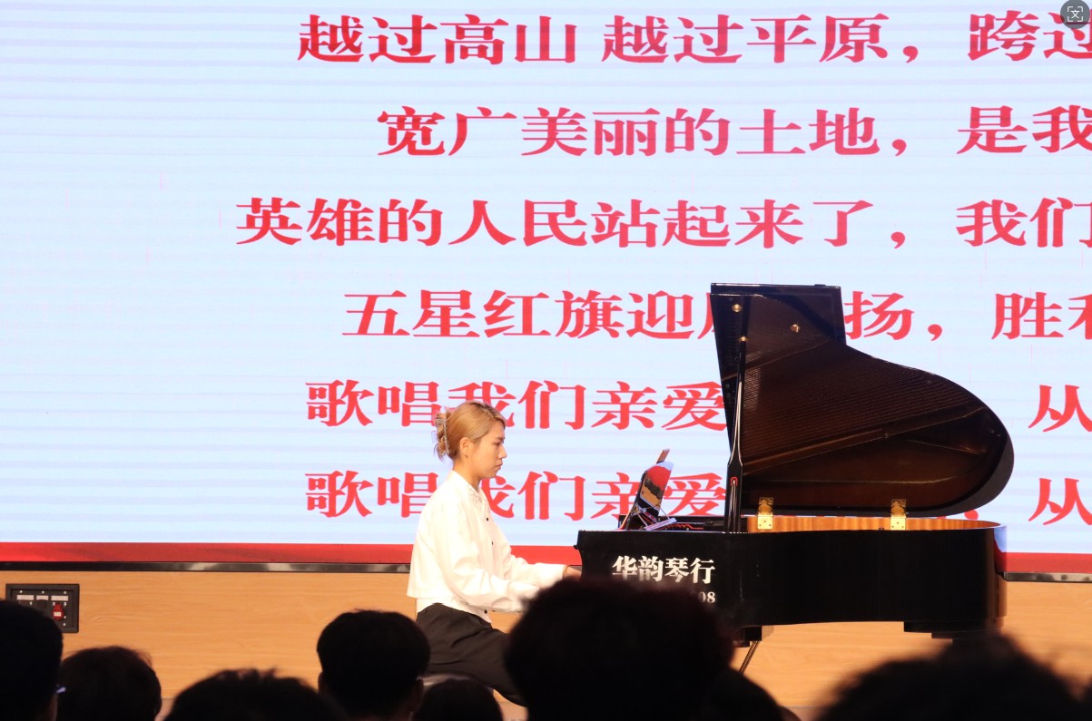 学院教师李文哲登上舞台,指尖在钢琴上流淌出激昂旋律,在场师生共同唱响《歌唱祖国》。熟悉的歌词、嘹亮的歌声回荡在会堂,展现着师生的艺术素养和精神风貌,表达对祖国的深切祝福。