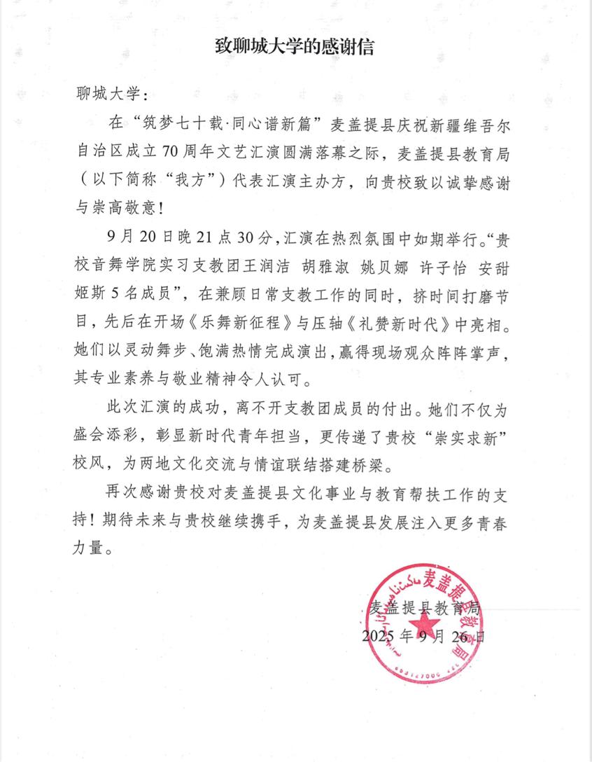 国庆前夕,一封来自新疆麦盖提县教育局的感谢信跨越千里,为成人网 援疆支教工作增添了一抹温暖而厚重的注脚。信中,麦盖提县教育局代表“筑梦七十载 同心谱新篇”文艺汇演主办方,向成人网 成人网 实习支教团致以诚挚感谢与崇高敬意,高度肯定他们在当地文化事业发展与教育帮扶工作中给予的有力支持,并热切期待未来能继续携手同行,共绘麦盖提县高质量发展新蓝图。