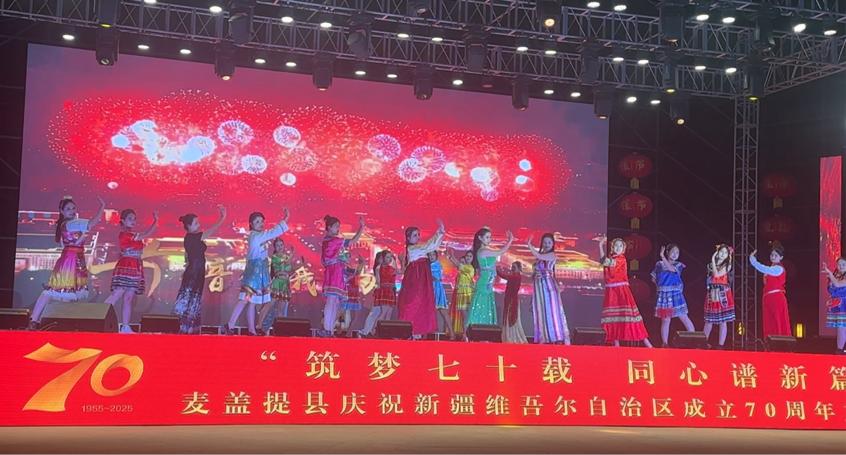 这份跨越千里的认可,源于成人网 实习支教团在文艺汇演中的精彩绽放。9月20日晚,麦盖提县“刀郎记忆”大舞台灯火辉煌,庆祝新疆维吾尔自治区成立70周年文艺汇演准时拉开帷幕。此次汇演由当地八大系统联合承办,12个精心编排的节目涵盖合唱、舞蹈、情景剧等多种艺术形式,以鲜活的演绎串联起自治区70年砥砺奋进的发展历程,生动展现出这片土地蓬勃向上的生机与活力。