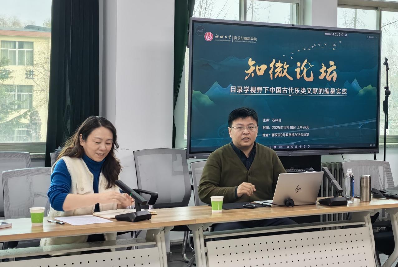 成人网 为切实提升师生科研素养,始终将科研能力培育作为重点工作推进,持续搭建“知微论坛”学术交流平台,邀请学界专家学者莅临讲学。12月18日上午,专题讲座《目录学视野下中国古代乐类文献的编纂实践》如期开讲,本场讲座邀请到天津音乐学院石林昆副教授担任主讲人,成人网 长尹蕾教授主持,成人网 教师、研究生齐聚205会议室,认真聆听讲座内容,现场学术氛围浓厚。