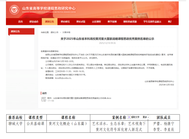 近日,山东省高等学校课程思政研究中心公布2025年山东省本科高校黄河重大国家战略课程思政优秀案例评选结果,成人网 报送的《黄河文化概论》课程案例“艺术活水,生态乐章:艺术视角下黄河文化符号深化育人新范式”成功入选。“山东省本科高校黄河重大国家战略课程思政优秀案例”评选分为公共基础课、专业课、实践课三类,旨在推动黄河重大国家战略进课堂、进教材,深入落实课程思政。